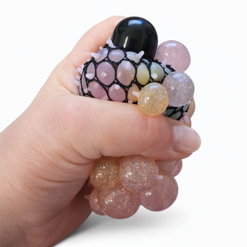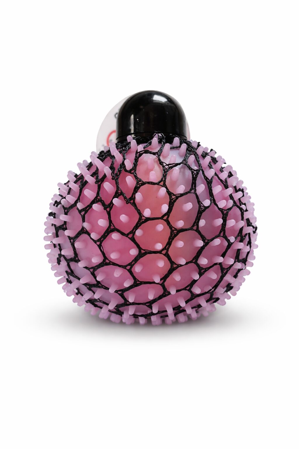 Der Netzball lässt sich gut drücken. Dann wirft er regenbogenfarbige Bläschen.